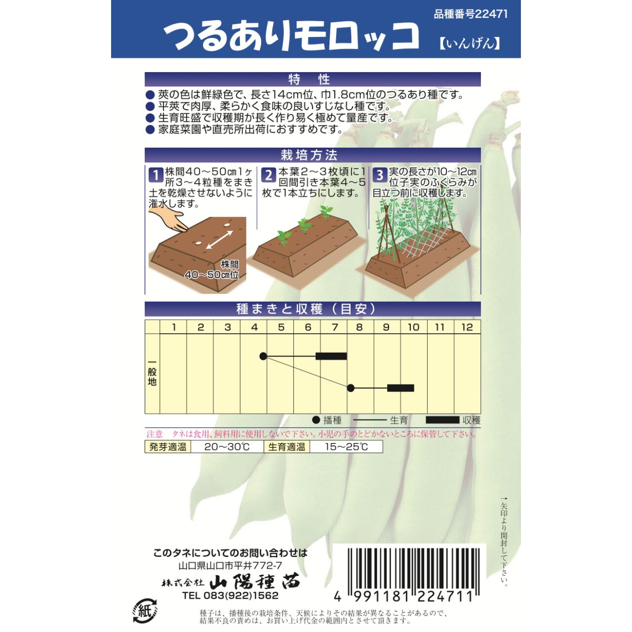 莢の色は鮮緑色で、長さ14㎝位、巾1.8㎝位のつるあり種です。 平莢で肉厚、軟らかく食味の良いすじなし種です。 生育旺盛で収穫期が長く作り易く極めて量産です。 家庭菜園や直売所出荷におすすめです。