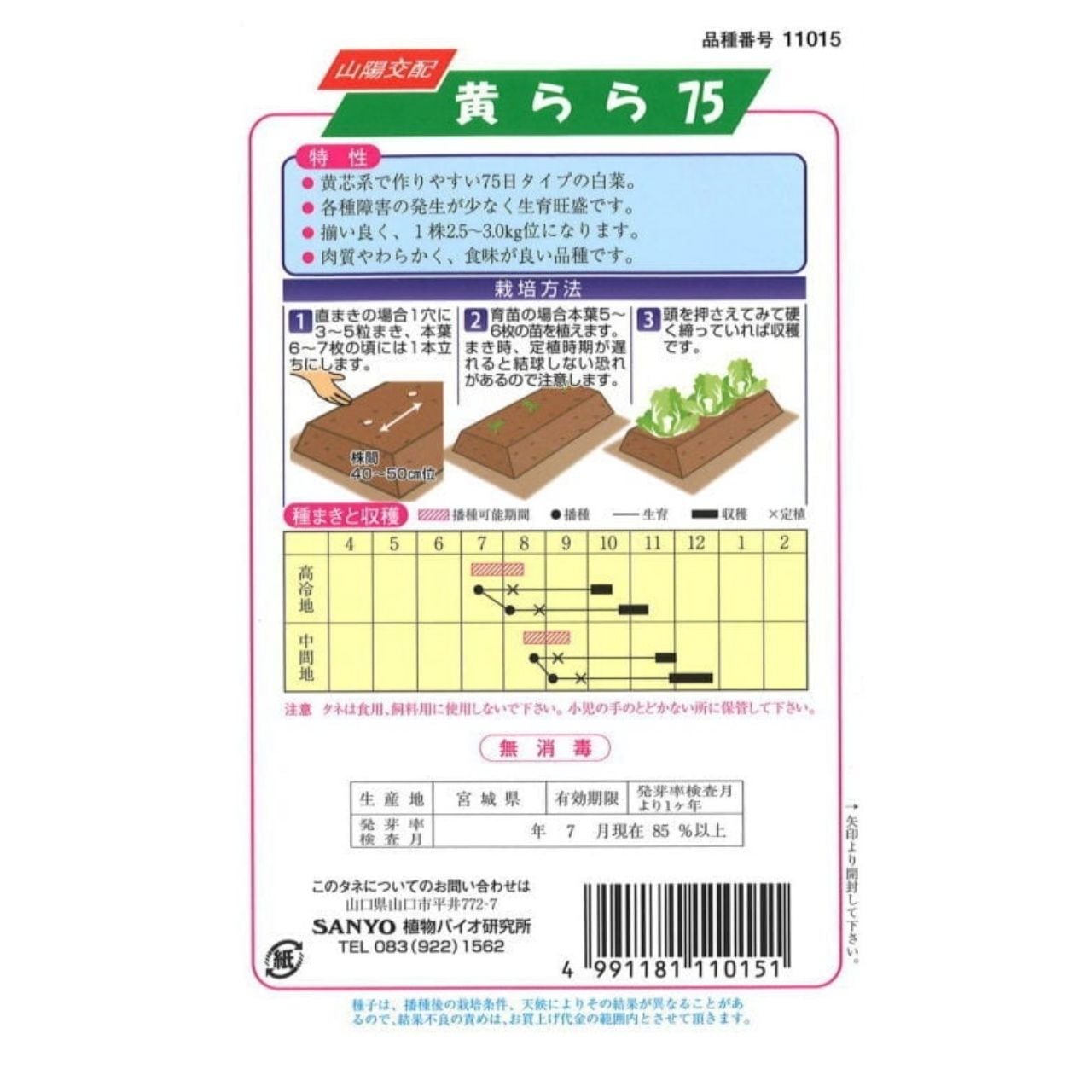 黄芯系で作りやすい75日タイプの白菜。 各種障害の発生が少なく生育旺盛です。 揃い良く、1株1.5kg~3.0kg位になります。 肉質やわらかく、食味が良い品種です。