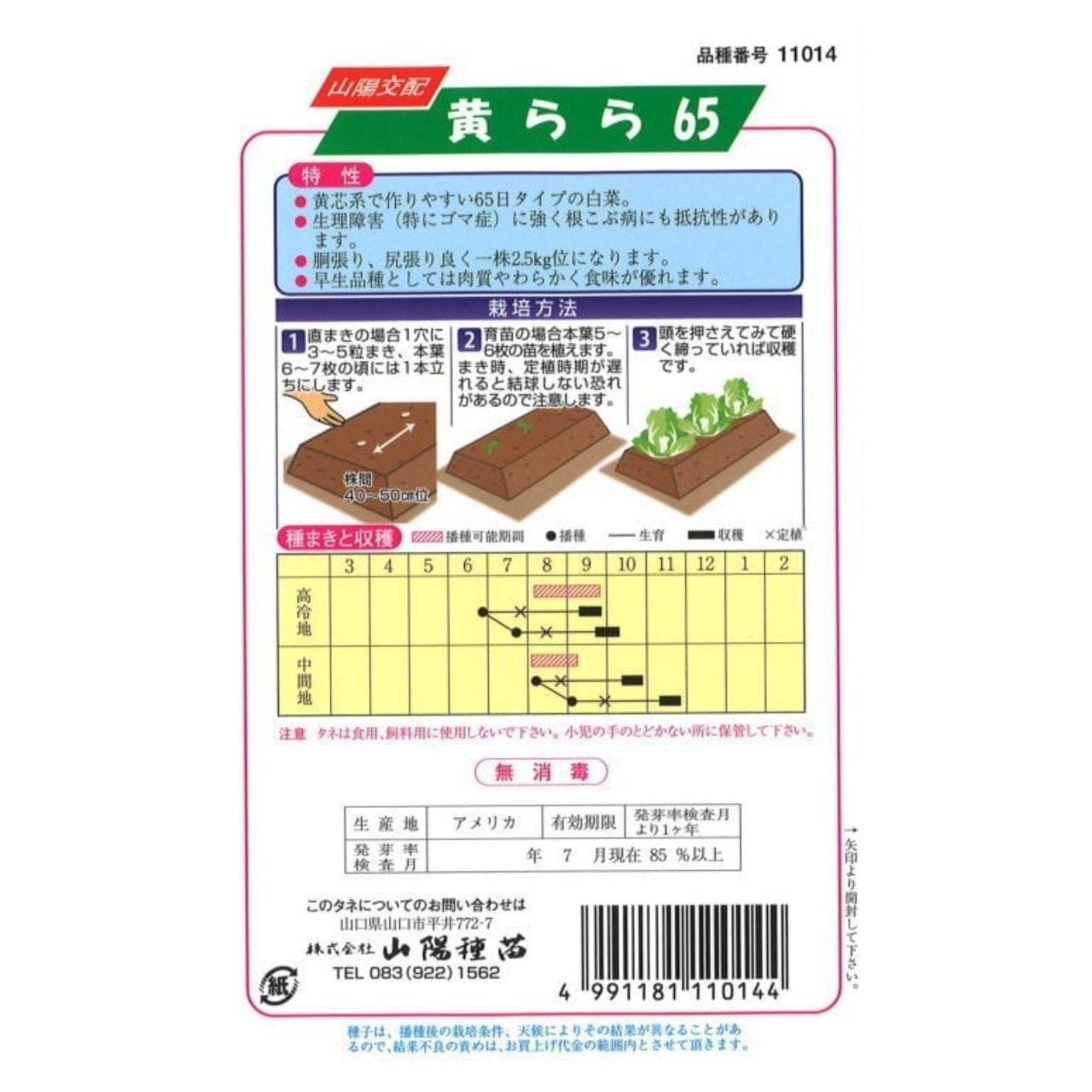 黄芯系で作りやすい65日タイプの白菜。 生理障害(特にゴマ症)に強く根こぶ病にも抵抗性があります。 胴張り、尻張り良く一株2.5kgくらいになります。 早生品種としては肉質が柔らかく食味が優れます。